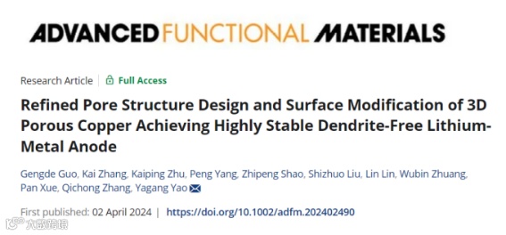 三维多孔铜的精细化孔结构设计与表面改性实现高稳定性高性能的无枝晶锂金属负极