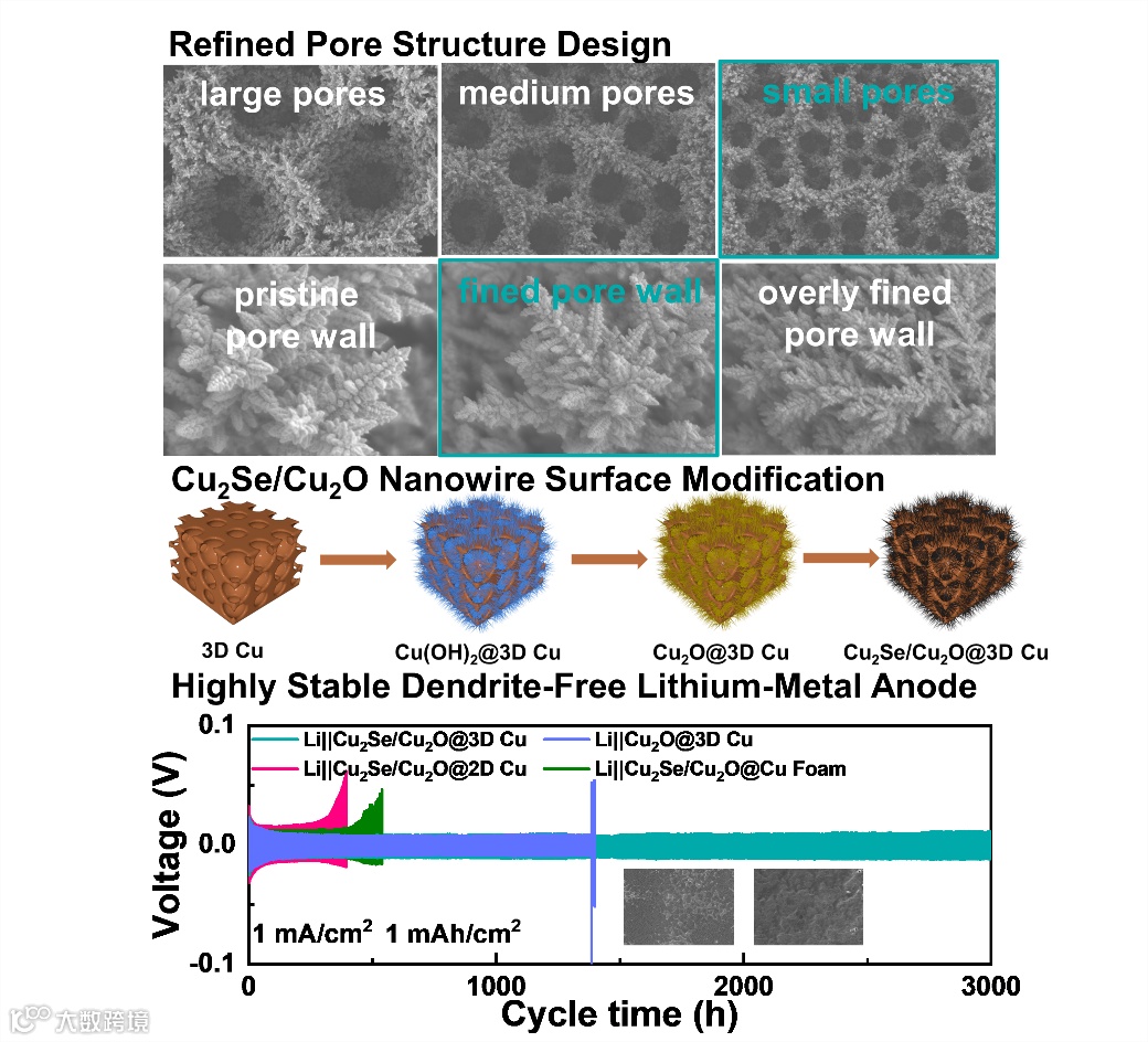 摘要图. 三维多孔铜的精细化孔结构设计及表面修饰实现高稳定无枝晶锂金属负极。