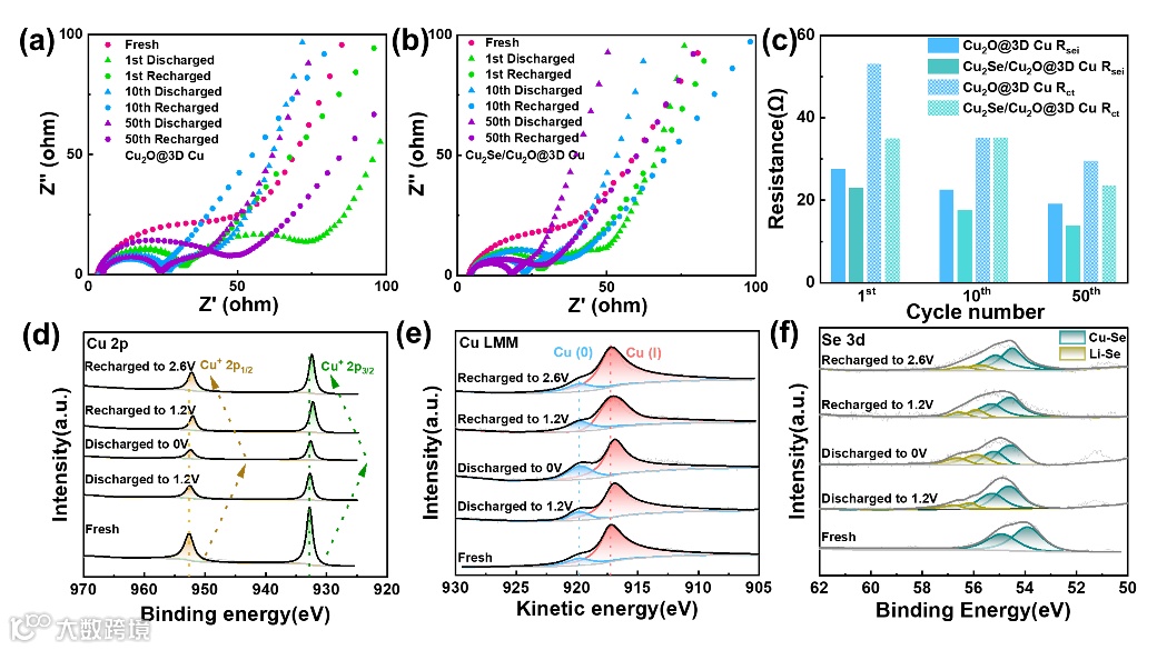 图4. (a)Cu2Se/Cu2O@3D Cu,(b)Cu2O@3D Cu在不同充放电阶段的EIS,(c)Cu2Se/Cu2O@3D Cu与Cu2O@3D Cu在不同放电阶段的电荷转移电阻与固态电解质层电阻的拟合电阻。Cu2Se/Cu2O@3D Cu的XPS能谱(d)Cu 2p,(e)Cu LMM,(f)Se 3d。