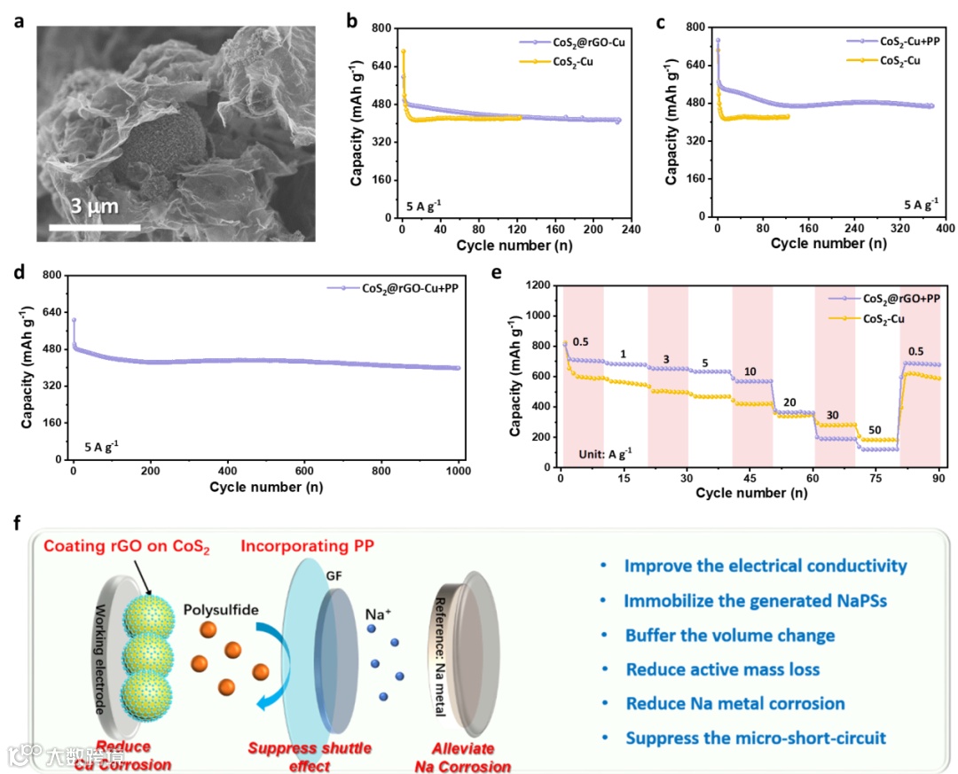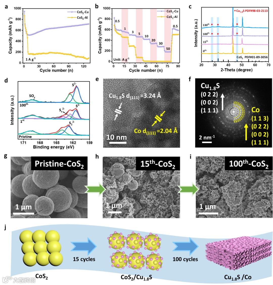 研究发现在醚基电解质中,Cu集流体在提高CoS2的比容量、循环稳定性和倍率性能方面起着关键作用,这是由于CoS2在循环中会与铜相互作用,发生CoS2→多硫化钠(NaPSs)→Co/Cu1.8S的不可逆相变,从而诱导电极形貌/结构的优化与重构,形成三维多孔网络结构。这种三维多孔结构没有表现出任何颗粒脱离,可以极大地改善Na+扩散动力学,减轻钠化/脱钠过程中巨大体积变化引起的应力/应变,促进储钠性能的增强(图1)。