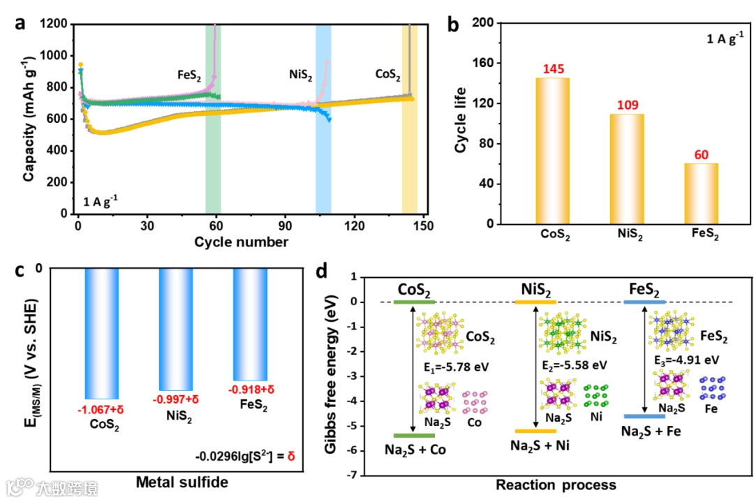 通过电极电势、理论计算系统探索了CoS2、NiS2、FeS2的失效规律(图3)。三种电极的EMS/M大小依次为,