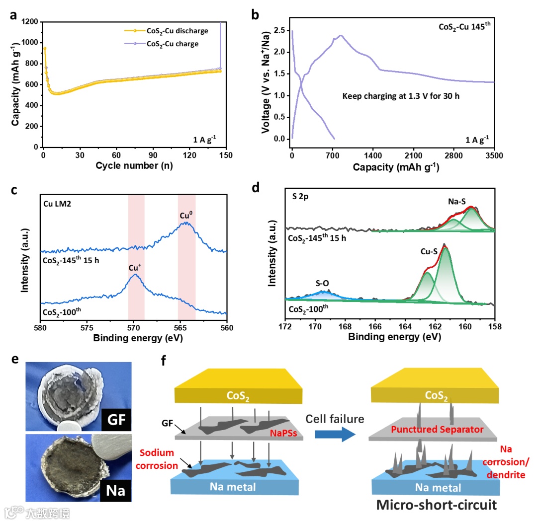 CoS2电极在循环145圈之后,充电过程不能达到截止电位(称为电位失效),即充电过程可以持续很长时间(>30 h)。研究结果表明CoS2在电化学反应过程中产生的NaPSs会引起Cu/Na金属的严重腐蚀。此外,由于Na+在电极-电解质界面上的不均匀分布,Na枝晶将动态形成。钠腐蚀/枝晶不可避免地会损坏/穿透隔膜,导致充电过程中的微短路,造成电池失效(图2)。并且,CoS2电极的失效过程与材料负载量及充放电电流大小息息相关。