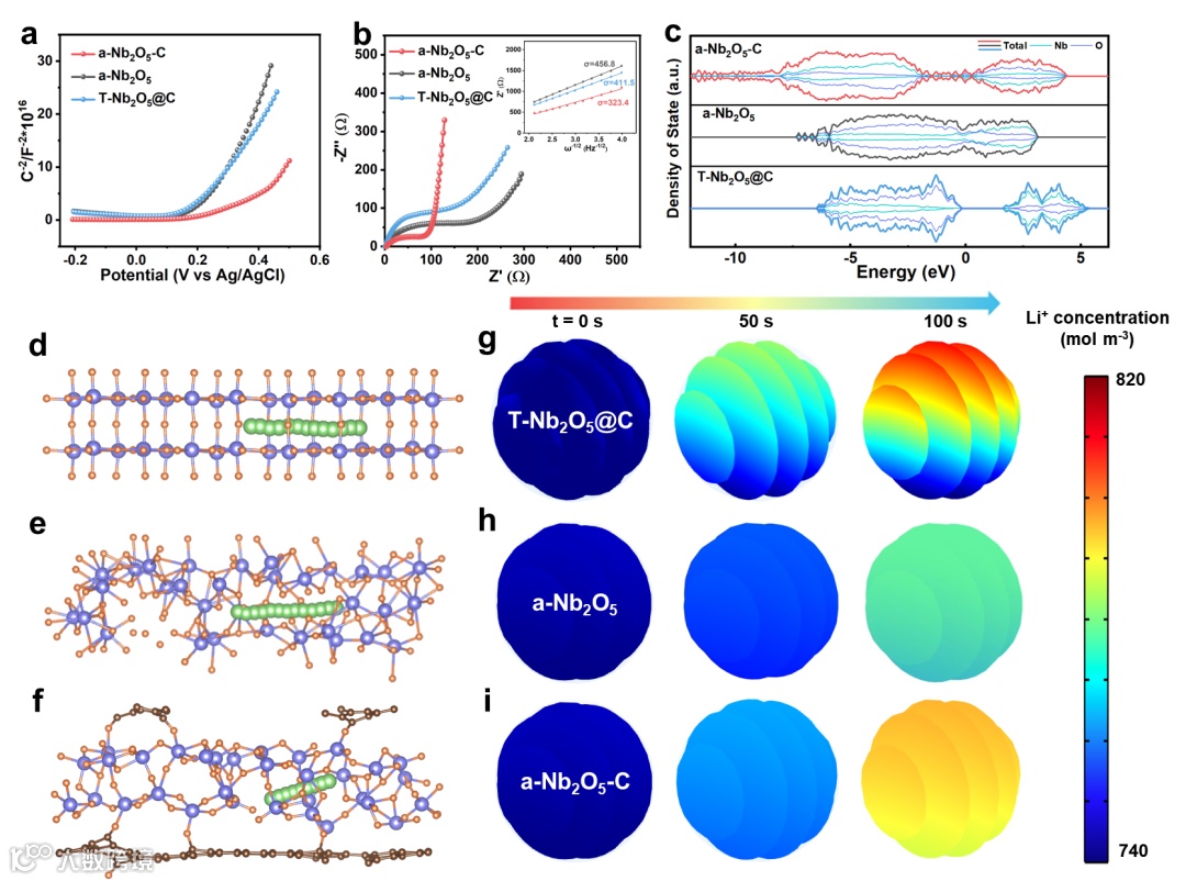 图5. DFT计算和有限元模拟研究结构特性对电化学性能的影响。a) 三个电极的Mott-Schottky图。b) 三个电极的Nyquist图和Z′与w−1/2 (w = 2𝜋f)的关系。c) 计算三个电极的态密度(DOS)。d) T-Nb2O5@C, e) a-Nb2O5, f) a-Nb2O5-C不同晶格面的模拟锂离子迁移路径。橙色、紫色和绿色的球分别代表O、Nb和Li原子。g) T-Nb2O5@C, h) a-Nb2O5, i) a-Nb2O5-C电极在0、25、50、75和100 s时锂离子浓度分布图。
