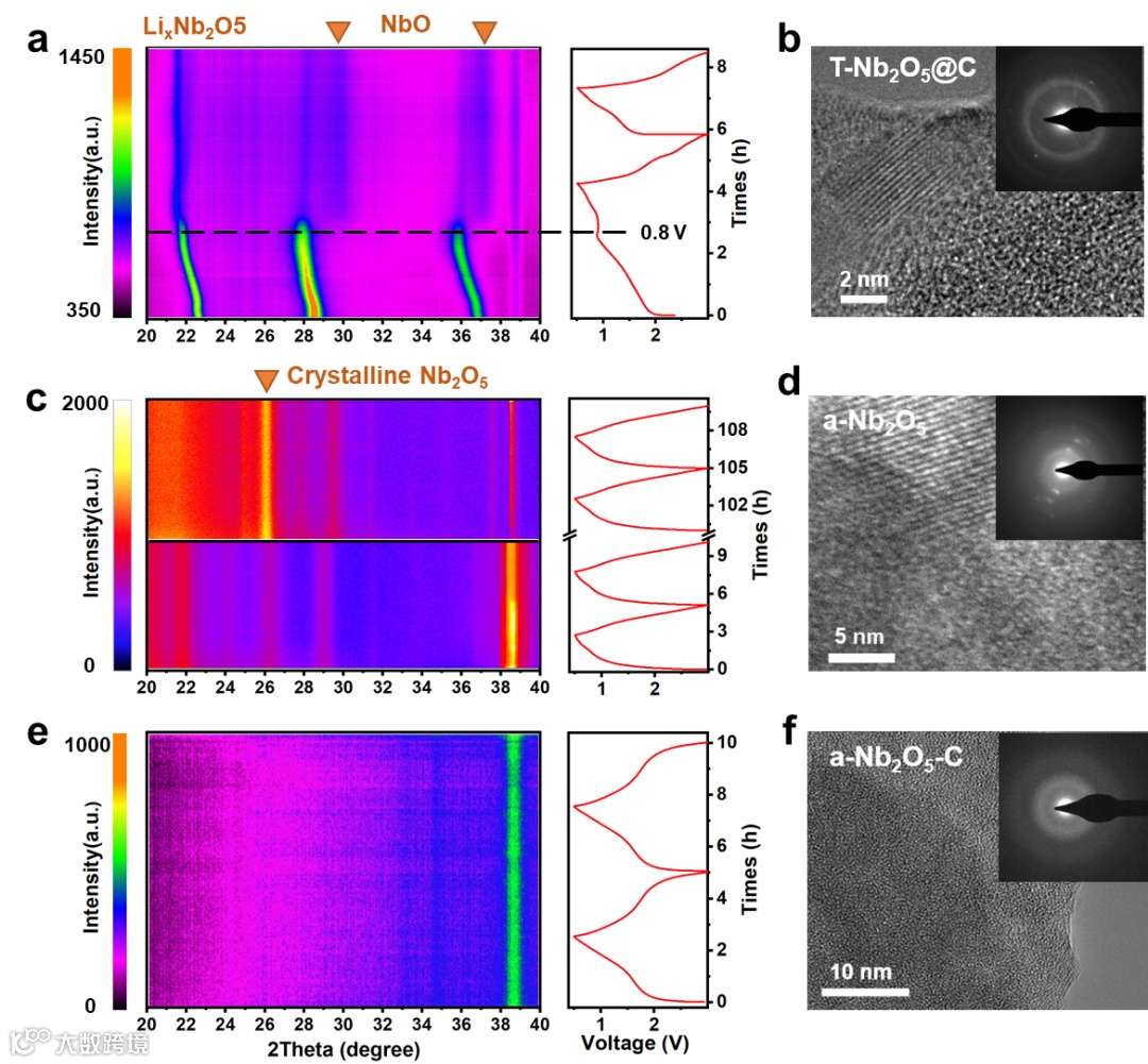 图4. 锂离子储存的机理研究。a) T-Nb2O5@C, c) a-Nb2O5电极前2次循环(下)和之后的20 ~ 22次循环(上) , e) a-Nb2O5-C样品的原位XRD演化,以及相应的电化学曲线。b) T-Nb2O5@C, d) a-Nb2O5, f) a-Nb2O5-C样品在3-0V范围内首次锂化后的透射电镜图。
