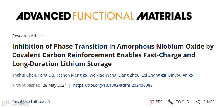 Inhibition of Phase Transition in Amorphous Niobium Oxide by Covalent Carbon Reinforcement Enables Fast-Charge and Long-Duration Lithium Storage, Adv. Funct. Mater. 2024,