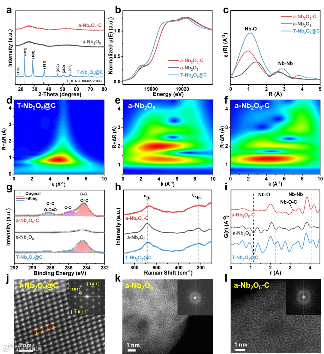 图2. T-Nb2O5@C、a-Nb2O5和a-Nb2O5-C的结构表征。a) T-Nb2O5@C、a-Nb2O5和a-Nb2O5-C的XRD谱图。T-Nb2O5@C、a-Nb2O5和a-Nb2O5-C的 Nb k边XANES (b)和FT-EXAFT (c)。d) T-Nb2O5@C、e) a-Nb2O5和f) a-Nb2O5-C的WT-EXAFT。T-Nb2O5@C、a-Nb2O5和a-Nb2O5-C的g) C 1s XPS光谱,h) 拉曼光谱,i) PDF数据。j) T-Nb2O5@C, k) a-Nb2O5和l) a-Nb2O5-C颗粒的HRTEM图像和相应的FFT图像。
