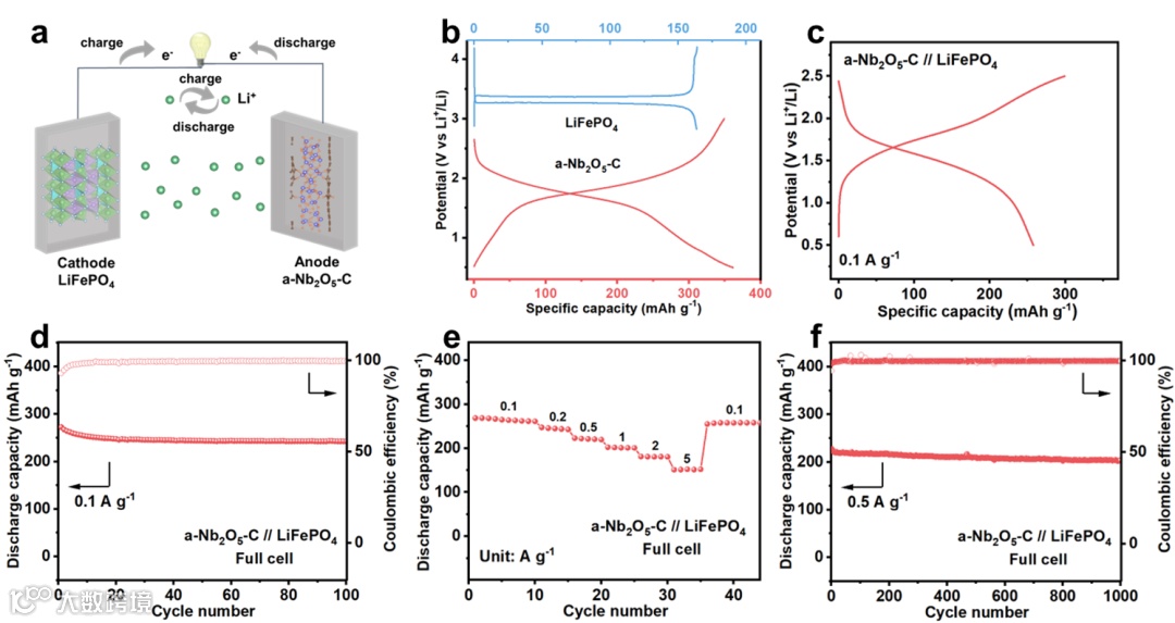 图6.全电池的电化学性能。a)以a-Nb2O5-C为负极,LiFePO4为正极的全电池示意图。b) 正负极的恒电流充放电曲线(GCD)。c) 全电池的充放电曲线。d) 在0.1 A g−1下测试循环性能和相应的库仑效率。e) 在0.1、0.2、0.5、1、2和5 A g−1下进行的倍率性能。f) 全电池在0.5 A g−1下的长循环稳定性。