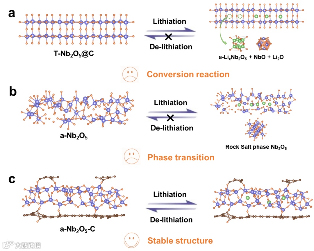 与纯非晶Nb2O5和碳包覆的晶态Nb2O5相比,碳增强的非晶Nb2O5在更宽的电压区间循环过程中始终保持非晶结构,有利于实现稳定的高能量密度锂离子电池。