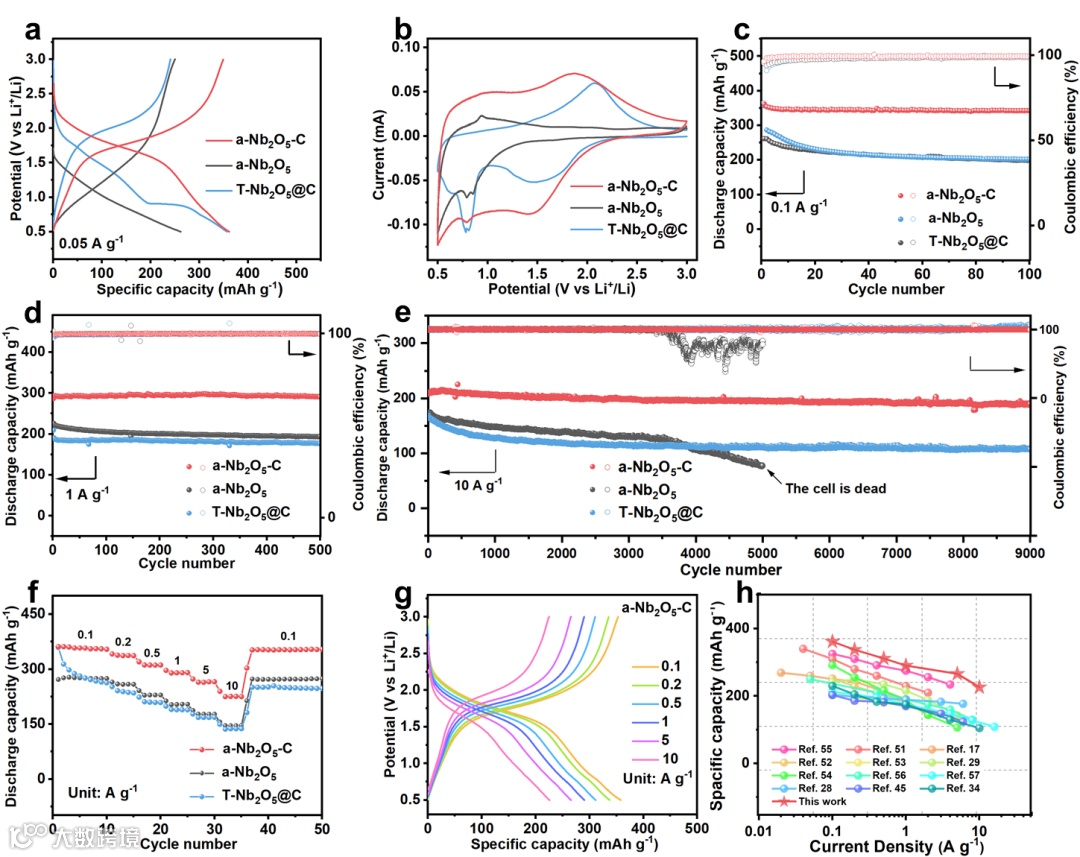 图3. T-Nb2O5@C、a-Nb2O5和a-Nb2O5-C在0.5 ~ 3.0 v下的储锂性能。a)充放电曲线和b)循环伏安曲线。电流密度为c) 0.1 A g−1和d) 1 A g−1下的循环性能。e)在1 A g−1的高电流密度下的长循环性能。f) 在0.1、0.2、0.5、1、5和10到0.1 A g−1的电流密度下的倍率性能。g) a-Nb2O5-C在不同倍率下的充放电曲线。h) a-Nb2O5-C在不同电流密度下的比容量与其他已报道的铌氧化物的比容量的比较。