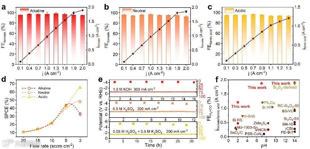 研究发现BiS-1催化剂在flow cell中展现出了超乎寻常的高活性。在碱性、中性和酸性环境下,其甲酸部分电流密度分别达到1.90、1.88和1.21 A cm-2。特别值得一提的是,在酸性条件下,二氧化碳的单程转化率更是高达65.4%。在稳定性测试中,BiS-1催化剂同样表现出色,在碱性环境下以300 mA cm-2的电流密度稳定运行了16小时,中性环境下运行了12小时,而在酸性环境下,则以200 mA cm-2的电流密度稳定运行了30小时。