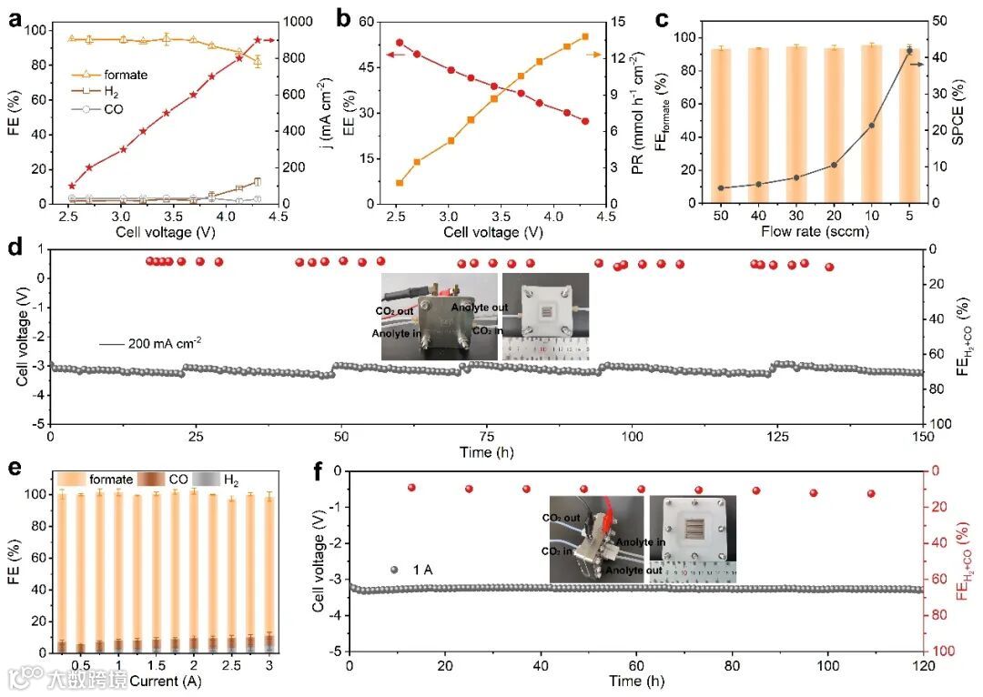 图3. BiS-1催化剂在flow cell中的电催化CO2性能。