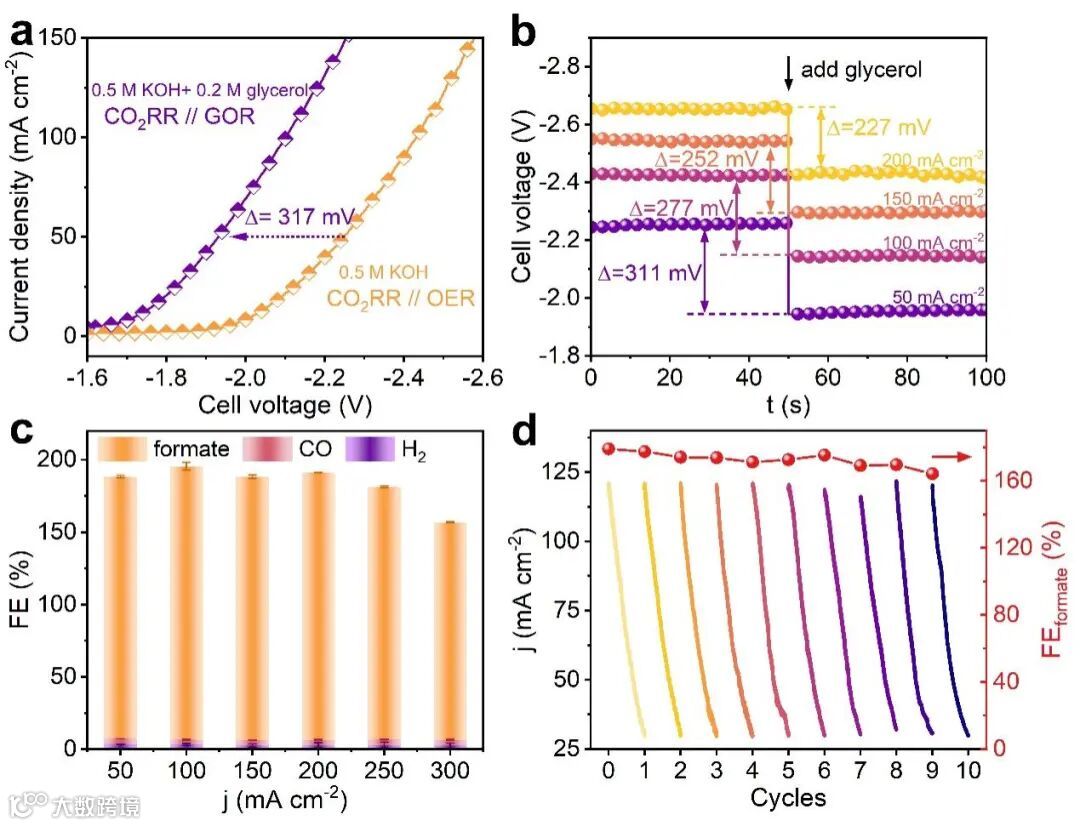 展示了一种将CO2RR与甘油氧化反应(GOR)耦合的策略。通过引入GOR来替代动力学上较为缓慢的析氧反应,实现了膜电极中阴阳极同时生产甲酸,显著降低了整个过程的能量消耗和起始电位,显示出在电催化CO2RR和GOR生产甲酸方面广阔的应用潜力。