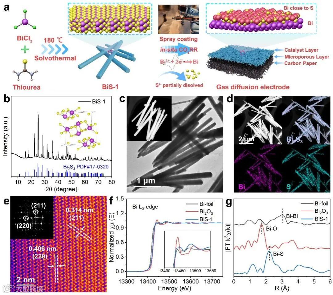 通过水热法用氯化铋和硫脲合成了一种硫化铋催化剂,并命名为BiS-1。在CO2RR重构后,BiS-1从硫化铋转化为单质铋,并有部分S保留。S的掺杂可以调控催化剂的电子结构,降低HCOO*中间体的生成能垒,显著增强了电催化CO2还原生成甲酸的催化活性。