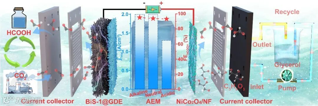 近日,安徽师范大学毛俊杰教授和杨健教授在国际知名期刊Angew. Chem. Int. Ed.上发表一篇题为“pH-Universal Electrocatalytic CO2 Reduction with Ampere-level Current Density on Doping-engineered Bismuth Sulfide”的研究文章。该文章分享了一种S掺杂的金属Bi催化剂(BiS-1),实现全pH电解液中安培级电流密度下高效生产甲酸,并在膜电极中与阳极甘油氧化反应进行耦合应用。