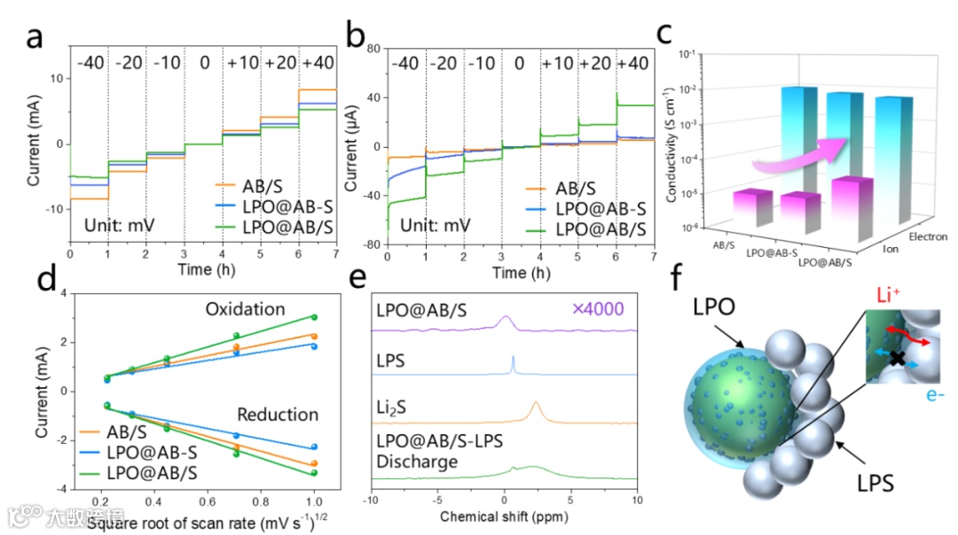 直流极化测试表明,离子传导性的LPO涂层提高复合正极的离子传输能力,LPO@AB/S-LPS复合材料的离子电导率达到4.3×10-5 S cm-1。CV曲线显示,LPO@AB/S-LPS电极表现出最高电流强度和最小过电势,表明提高的硫正极反应动力学。不同电极的峰值电流与扫描速率的平方根线性相关,表明电极反应是扩散控制过程。Li+扩散能力可以通过氧化还原过程中电流峰值的拟合斜率值来估计。LPO@AB/S-LPS表现出提高的Li+扩散速率,表明LPO涂层有助于促进CS颗粒和SSE之间的Li+传输。