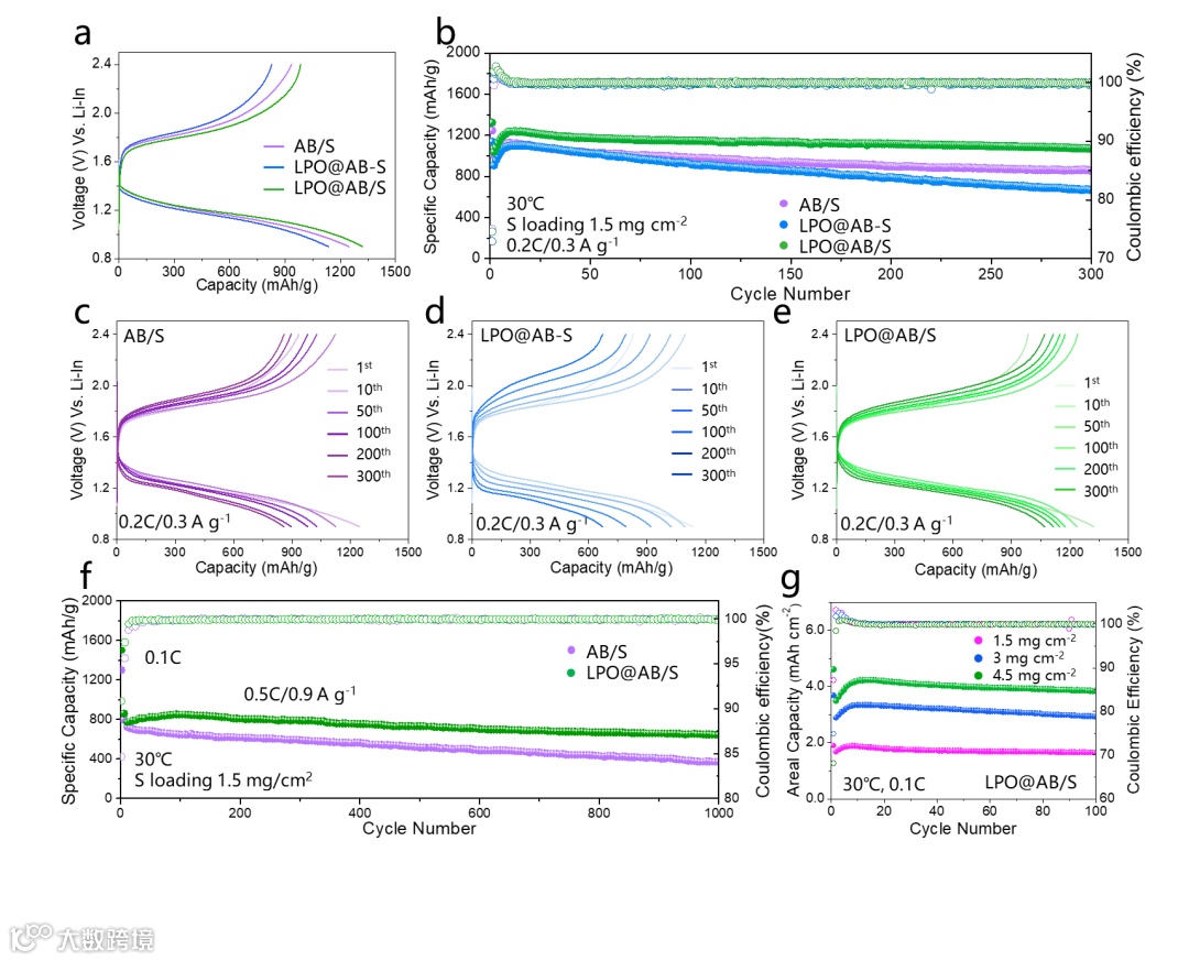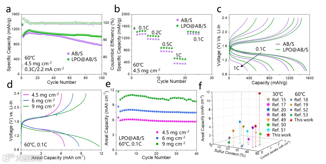 在60℃下评估ASSSLSBs的高温电化学性能。硫负载量为4.5 mg cm-2下,LPO@AB/S正极在0.3 C下表现出1177 mAh g-1放电比容量,对应于5.3 mAh cm-2面容量。经过100次循环后,LPO@AB/S表现出85.4%容量保持率。在负载量为9.0 mg cm-2下,LPO@AB/S正极0.1 C下能够达到11.7 mAh cm-2的高初始放电面容量,且保持稳定循环。