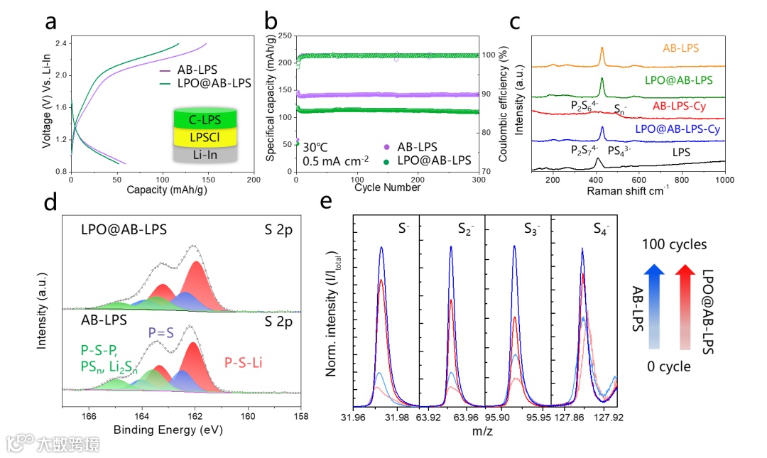 固态电解质的电化学稳定性对ASSLSBs的电化学性能有显着影响。充放电曲线和Raman结果表明LPS电解质的分解反应被抑制,这归因于LPO@AB和LPS之间的电子接触面积减少。XPS和TOF-SIMS结果显示,LPO@AB-LPS正极中生成更少的多硫化物。这些表明LPO界面工程可以抑制SSE的不良反应,增强三相界面的稳定性,从而提高ASSLSBs的电化学性能。