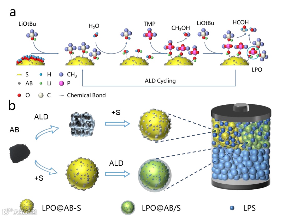 图1. (a) ALD衍生LPO的反应机理;(b) ASSLSBs中硫复合材料的两种ALD涂层策略示意图