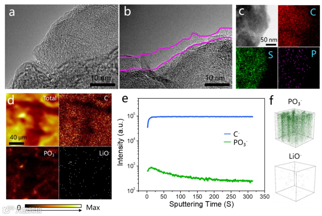 HRTEM显示LPO@AB/S表面覆盖一层无定型涂层,厚度约为5 nm。C、S和P元素均匀分布,表明LPO已被引入复合材料。TOF-SIMS的二次碎片中观察到源自LPO的PO3-和LiO-物质。PO3-强度先增加后减小,对应于表面的LPO涂层。这些结果表明样品表面存在LPO涂层,且仅存在于AB/S颗粒表面。