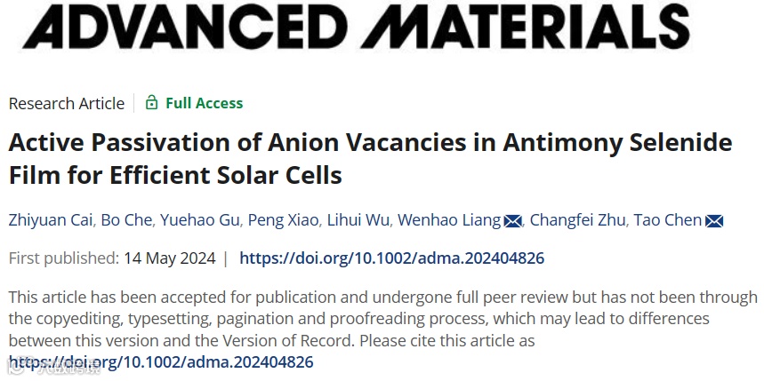 近日,中国科学技术大学陈涛教授团队在Advanced Materials合作发表了题为“Active Passivation of Anion Vacancies in Antimony Selenide Film for Efficient Solar Cells”的研究论文。在这项工作中,作者发展高真空条件下利用硫蒸气对硒化锑薄膜进行掺杂处理的方法,通过深能级瞬态光谱(DLTS)表征缺陷性质揭示了薄膜中硒空位缺陷的有效钝化。接着通过将密度泛函理论(DFT)计算与DLTS表征相结合,揭示了缺陷钝化的微观过程,并且解释了这种演化的发生机制。最后基于该薄膜制备了顶衬结构的太阳能电池器件。由于缺陷的有效钝化,抑制了器件中的缺陷辅助复合,从而减少了开路电压赤字,显著提升了器件光电转换效率。