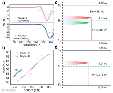 图3. a) 深能级瞬态光谱的信号和b)由光谱信号得到的阿伦尼乌斯图,c) 未处理和d) 处理薄膜中的能级和缺陷能级示意图