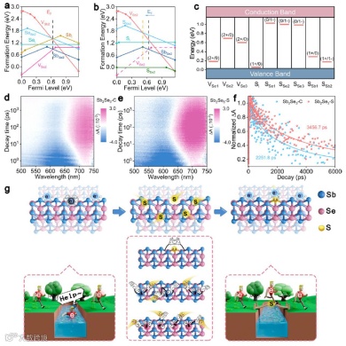 图4. a)计算出的富sb条件下硒化锑体相中缺陷形成能随费米能级的函数关系; b)富硒硒化锑体相中典型的低形成能缺陷和掺硫缺陷的形成能随费米能级的函数计算; c)计算出的禁带内不同位置的本征缺陷和S掺杂缺陷的跃迁能级。d) Sb2Se3-C和e) Sb2Se3-S薄膜的超快光谱mapping ; f) 690nm波长下监测的瞬态衰减动力学(散点)和拟合(实线);g)缺陷钝化机理示意图