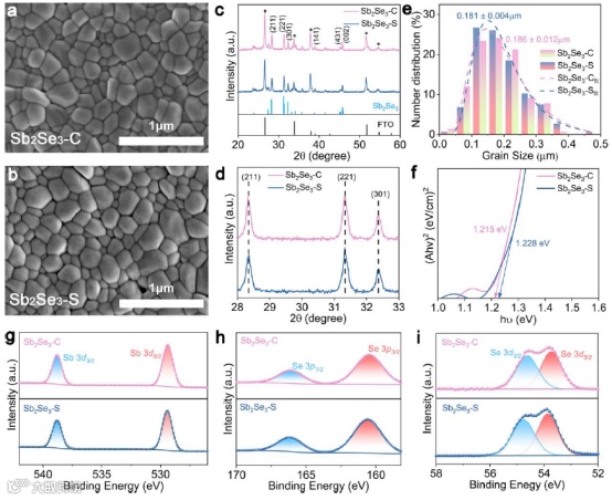 图1. a) 未处理和b) 处理后薄膜的SEM形貌图;c) 薄膜的XRD谱图和d) 局部放大的XRD谱图;e) 薄膜的晶粒尺寸分布统计 f) 薄膜的光学带隙拟合 g) Sb 3d,h) Se3p 和i) Se3d的XPS特征峰