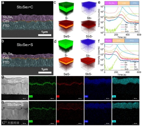 图2. FTO/CdS/Sb2Se3-C和FTO/CdS/Sb2Se3-S薄膜的a, b) SEM横截面图像,c, d) TOF-SIMS三维断层扫描结果,e, f)深度剖面和g, h) STEM和相应的元素映射TOF-SIMS。
