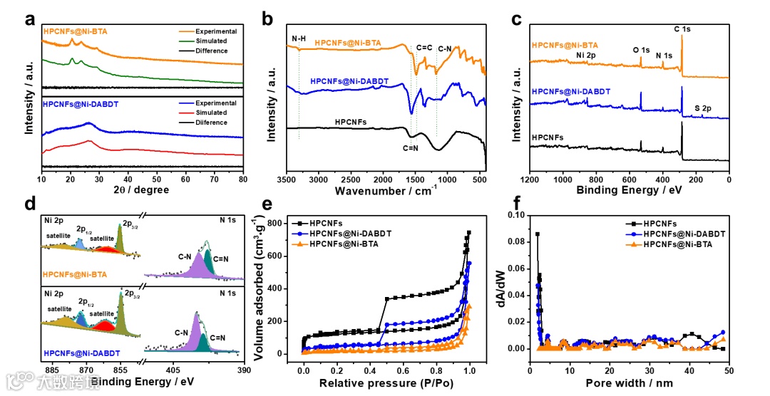 Fig. 2. Structural characterizations of HPCNFs, HPCNFs@Ni-DABDT, and HPCNFs@Ni-BTA. (a) Experimental and simulated XRD patterns of HPCNFs@Ni-DABDT and HPCNFs@Ni-BTA. (b) FT-IR spectra of HPCNFs, HPCNFs@Ni-DABDT, and HPCNFs@Ni-BTA. (c) XPS survey spectra and (d) Ni2p and N1s XPS spectra of HPCNFs, HPCNFs@Ni-DABDT, and HPCNFs@Ni-BTA. (e) Nitrogen adsorption–desorption isotherms and (f) the corresponding pore size distributions of HPCNFs, HPCNFs@Ni-DABDT, and HPCNFs@Ni-BTA.