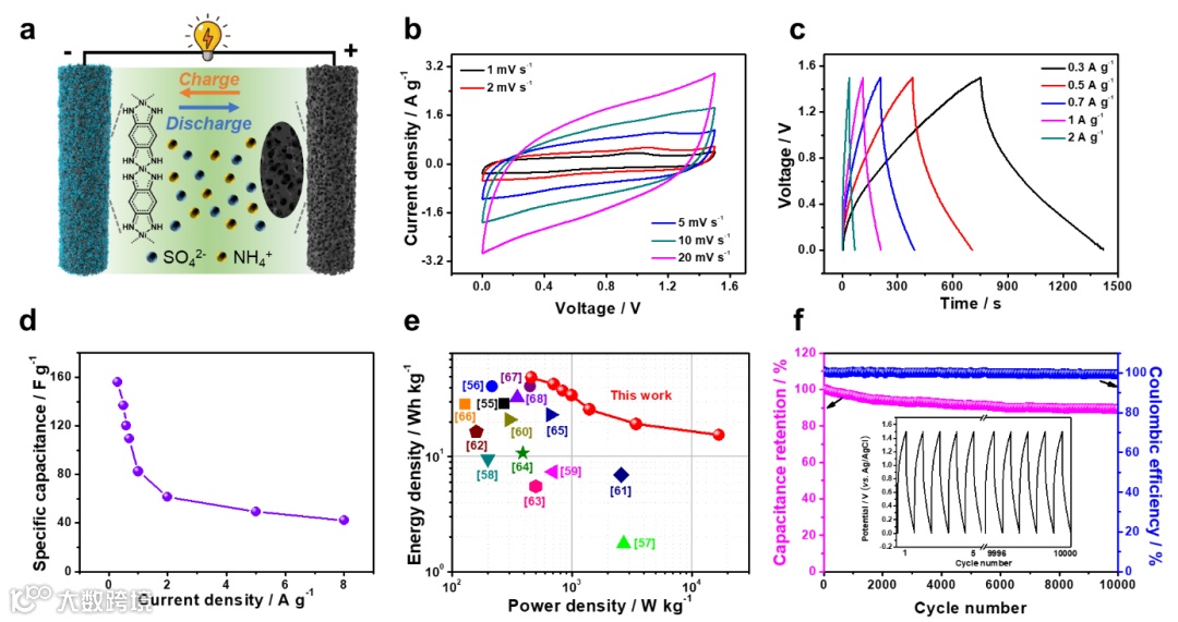 Fig. 5. Electrochemical performance of HPCNFs@Ni-BTA//HPCNFs NH4+ HSCs. (a) Schematic illustration of the designed NH4+ HSCs. (b) CV curves at various scan rates from 1 to 20 mV s−1. (c) GCD profiles at different current densities from 0.3 to 2 A g−1. (d) Specific capacitances derived from GCD profiles as a function of current density. (e) Ragone plots of HPCNFs@Ni-BTA//HPCNFs in comparison with other state-of-the art SCs. (f) Cycling stability and Coulombic efficiencies of HPCNFs@Ni-BTA//HPCNFs at 2 A g−1. The inset shows the first five and the last five GCD curves of HPCNFs@Ni-BTA//HPCNFs.