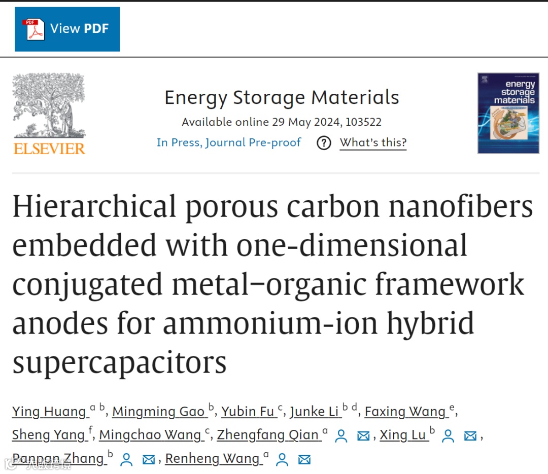 分级多孔碳纳米纤维支撑一维共轭金属有机框架用于铵离子混合超级电容器
