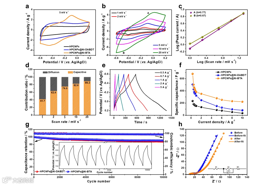 Fig. 3. Electrochemical behavior of HPCNFs@Ni-BTA electrode measured in a three-electrode cell. (a) CV curves of HPCNFs, HPCNFs@Ni-DABDT, and HPCNFs@Ni-BTA electrodes at 5 mV s−1. (b) CV curves of the HPCNFs@Ni-BTA electrode at different scan rates. (c) Log i versus log v plots for each redox peak in CV curves. (d) Normalized contribution ratios of the capacitive (orange) and diffusion-controlled (black) currents as a function of scan rate. (e) GCD profiles of the HPCNFs@Ni-BTA electrode at current densities from 0.5 to 5 A g−1. (f) Specific capacitances of the HPCNFs, HPCNFs@Ni-DABDT, and HPCNFs@Ni-BTA electrodes calculated from GCD profiles as a function of current density. (g) Cycling stability and Coulombic efficiencies of the HPCNFs@Ni-DABDT and HPCNFs@Ni-BTA electrodes at a current density of 5 A g−1. The inset shows the first five and the last five GCD profiles. (h) Nyquist plots of the HPCNFs@Ni-BTA electrode before and after 10,000 charge–discharge cycles.