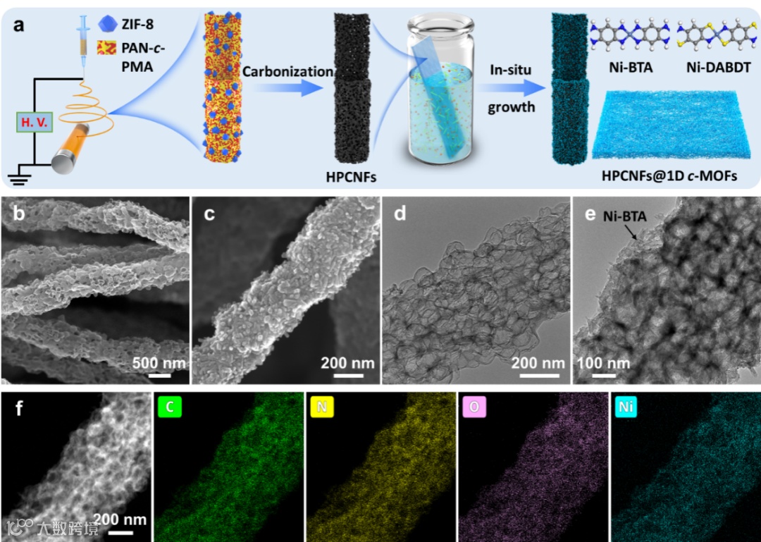 Fig. 1. (a) Schematic illustration of the preparation procedure of HPCNFs@1D c-MOFs. (b) SEM image and (d) TEM image of pristine HPCNFs. (c) SEM image and (e) TEM image of HPCNFs@Ni-BTA. (f) HAADF and EDX elemental mappings of HPCNFs@Ni-BTA for C (green), N (yellow), O (purple), and Ni (blue) elements.