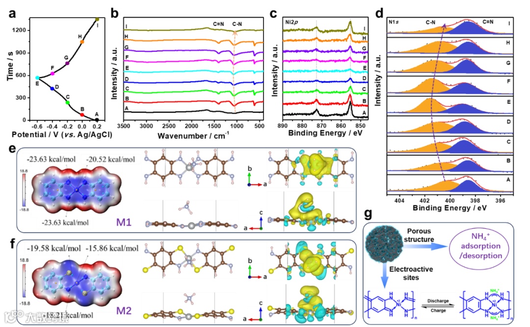 Fig. 4. Charge-storage mechanism and structural analysis of the HPCNFs@Ni-BTA electrode during the charge/discharge process measured in a three-electrode cell. (a) GCD profile of the HPCNFs@Ni-BTA electrode at 0.5 A g−1 and the corresponding ex-situ (b) FT-IR spectra, (c) Ni 2p XPS spectra, (d) N 1s XPS spectra of the HPCNFs@Ni-BTA electrode at different charge/discharge potentials. (e, f) Calculated MESP distributions of model compounds M1 and M2 with the corresponding optimized NH4+-adsorbed atomic configurations. (g) Proposed NH4+ storage mechanism of the HPCNFs@Ni-BTA.