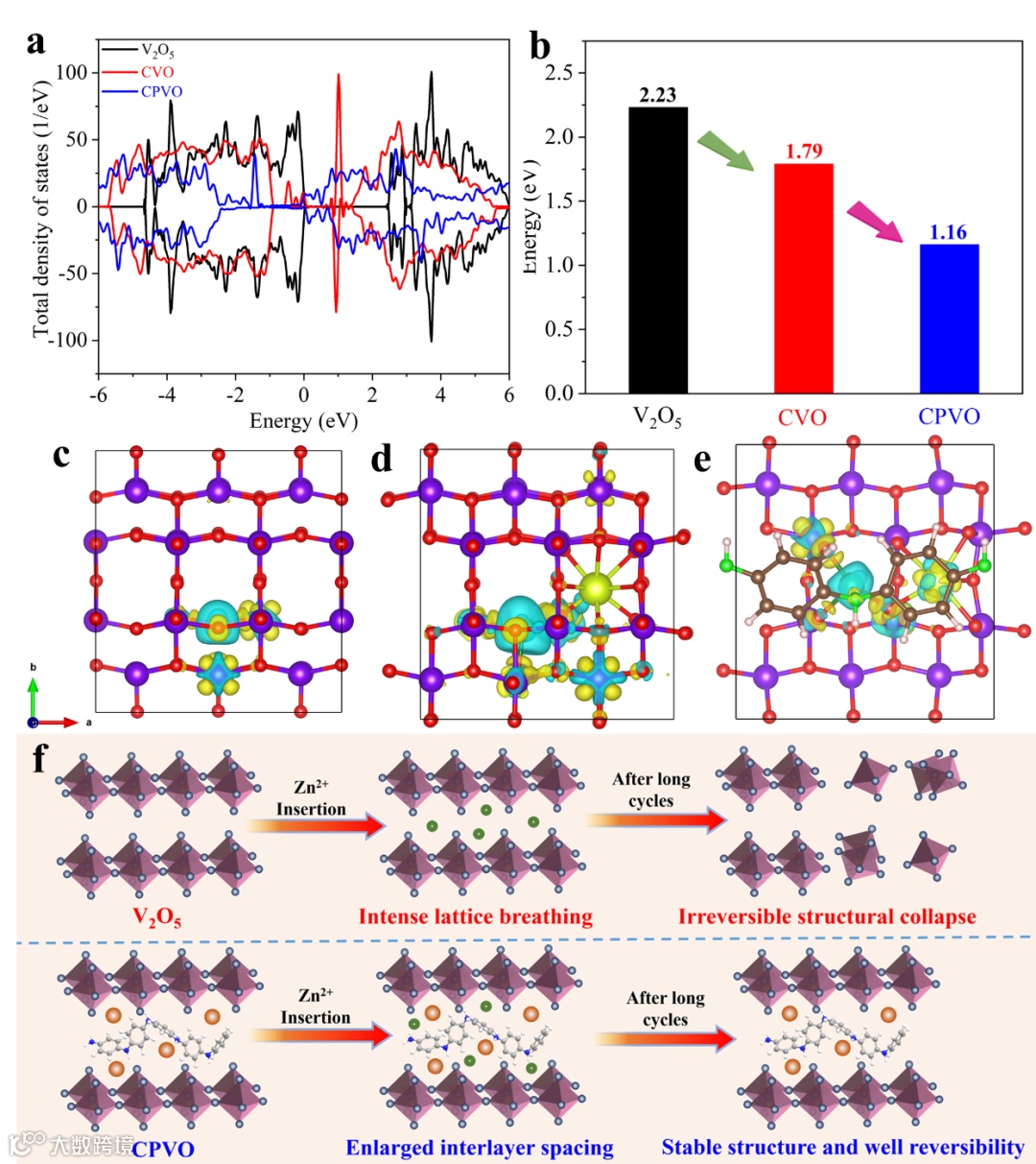 图6. (a) V2O5、CVO和CPVO的态密度图;(b) V2O5、CVO和CPVO的Zn2+吸附能;(c-e)V2O5、CVO和CPVO的差分电荷密度分布图;(f) V2O5和CPVO的循环性能对比图。