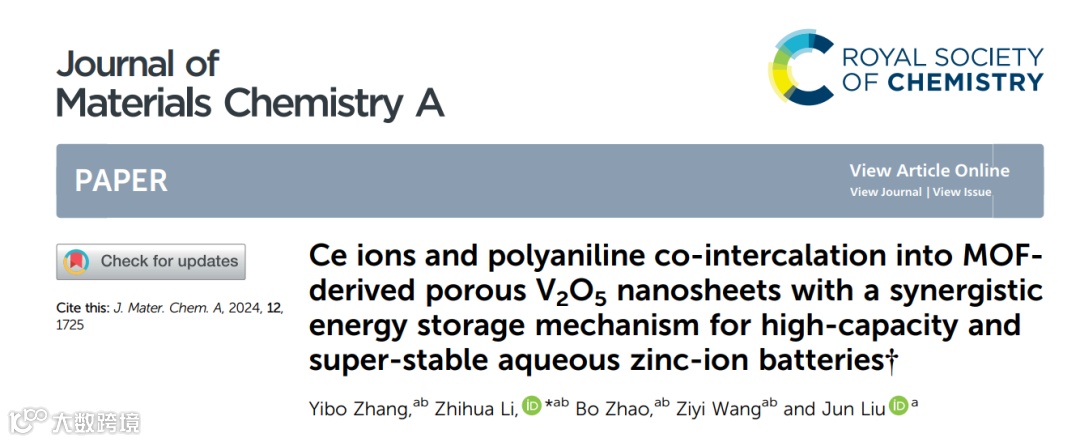 Ce ions and polyaniline co-intercalation into MOF-derived porous V2O5nanosheets with synergistic energy storage mechanism for high-capacity and super-stable aqueous zinc-ion batteries.Yibo Zhang, Zhihua Li*, Bo Zhao, Ziyi Wang, Jun Liu.Journal of Materials Chemistry A,