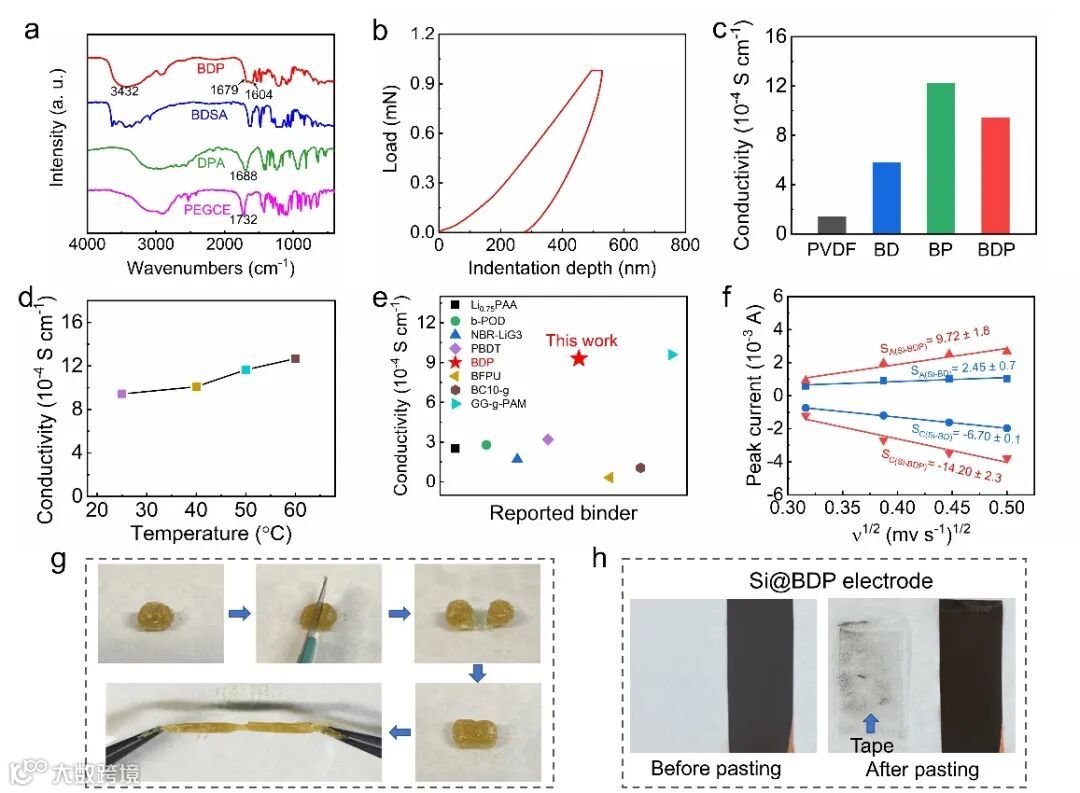 本研究通过界面缩聚反应制备了具有多功能性质的BDP聚合物链,并通过核磁共振氢谱和傅里叶变换红外光谱验证其合成。纳米压痕试验显示,BDP具有0.15 Gpa的硬度和2.9 Gpa的弹性模量。在不锈钢阻塞对称电池中测试其离子电导率,结果显示BDP聚合物在室温下具有高达9.4 × 10−4 S cm−1的离子电导率。通过循环伏安曲线以及Randles-Sevcik公式,验证了BDP增强的离子扩散能力是由于聚醚基团的引入。动态双硫键交互和可逆的超分子相互作用力使BDP表现出自修复能力。