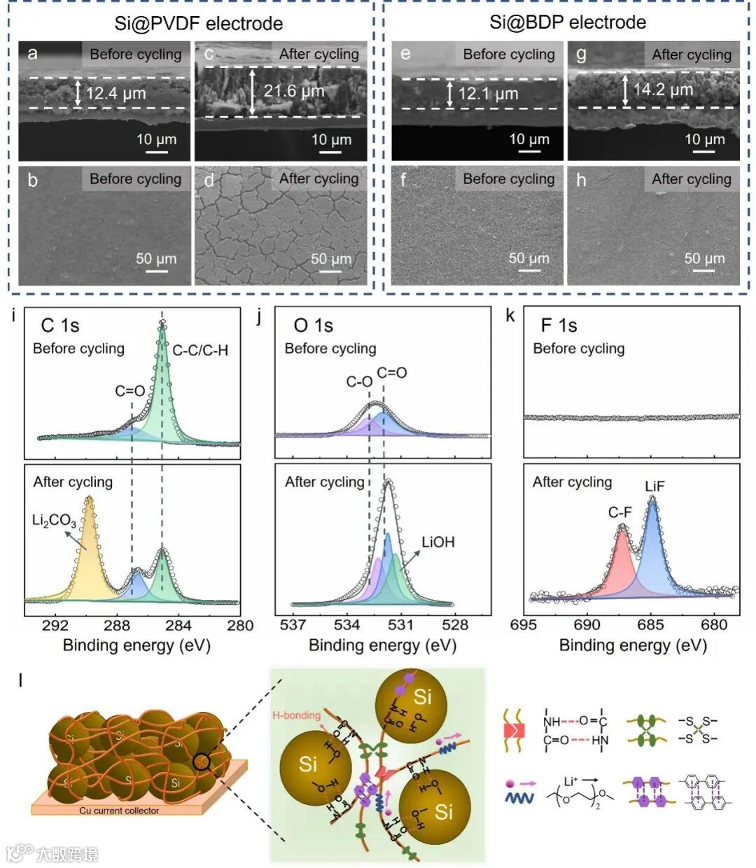 图4. Si@PVDF和Si@BDP的电极结构稳定性对比图和Si@BDP的电极界面SEI层的XPS元素分析