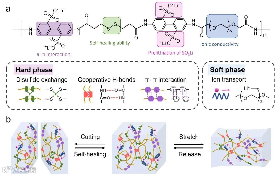 图1. (a) BDP聚合物粘结剂的结构和硬/软相 相互作用示意图;(b) BDP聚合物的自修复能力和延展性。