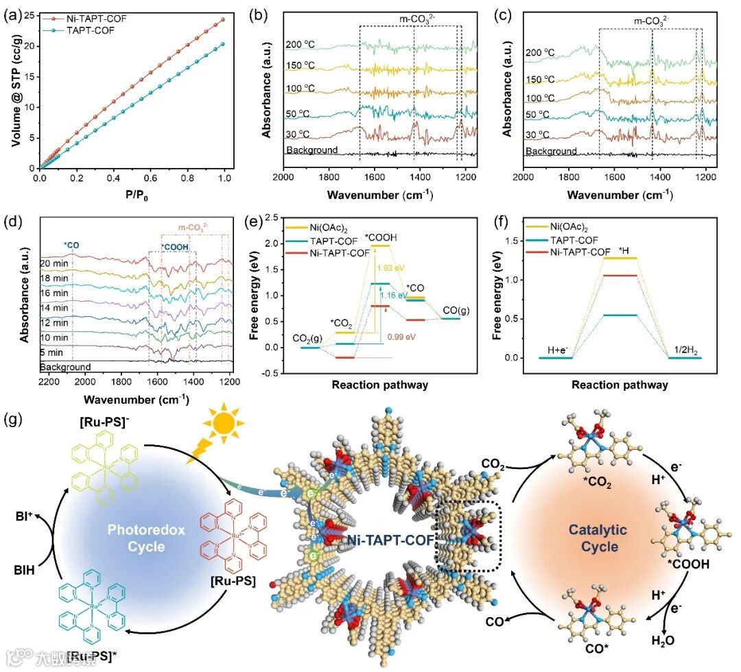 Figure 4. (a) CO2sorption isotherms of TAPT-COF and Ni-TAPT-COF at 298 K. The temperature-dependent in-situ DRIFTS of CO2adsorption from 30 to 200 °C over (b) TAPT-COF and (c) Ni-TAPT-COF catalysts. (d) In-situ DRIFTS spectra of CO2and H2O interaction with Ni-TAPT-COF under light irradiation. DFT-calculated Gibbs free energy (ΔG, eV) profiles for (e) CO2photoreduction and (f) hydrogen evolution on Ni(OAc)2, TAPT-COF, and Ni-TAPT-COF. (g) Proposed mechanism for the photocatalytic CO2reduction into CO over Ni-TAPT-COF under visible light irradiation with Ru-PS as the photosensitizer and BIH as the electron donor.