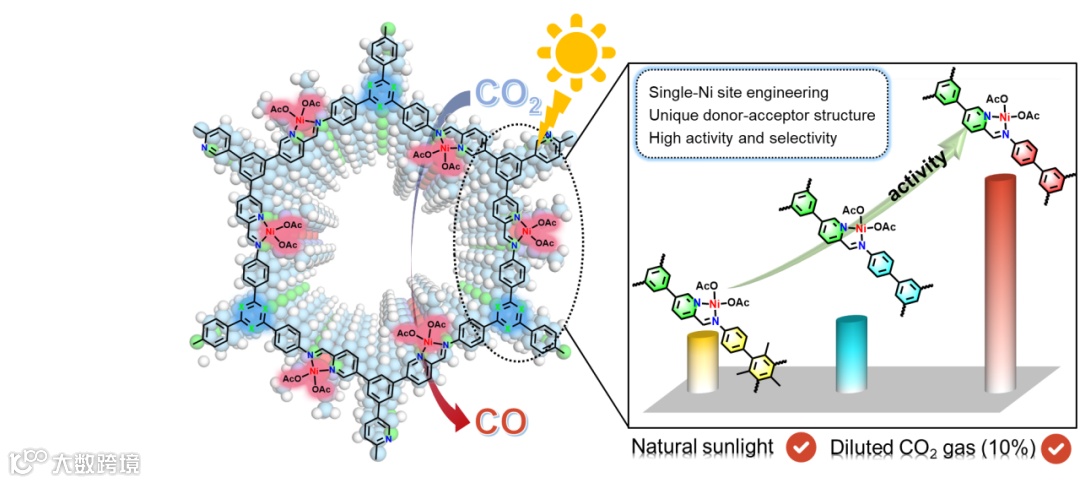 最优催化剂的Ni-TAPT-COF的CO产率达到了创纪录的25.5 mmol g−1 h−1,选择性达到了98.8%。即使在自然阳光驱动的稀释CO2(10%)也可以达到令人印象深刻的2.4 mmol g-1 h-1的CO生成速率,甚至超过了大多数高浓度CO2光催化剂。