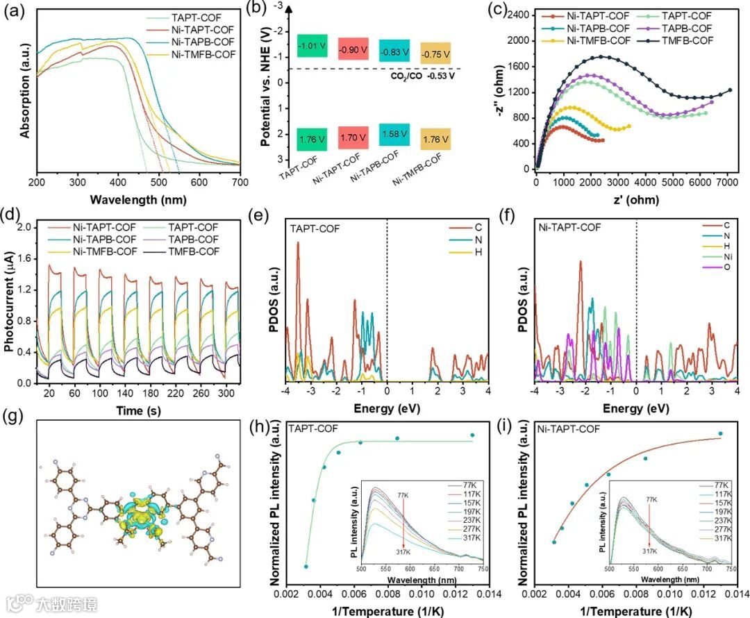Figure 2. Optical and electronic properties. (a) UV-vis DRS spectra, (b) experimental estimated band structure diagrams, (c) EIS Nyquist plots, and (d) photocurrent curves of COFs and Ni-COFs. The PDOS of (e) TAPT-COF and (f) Ni-TAPT-COF. (g) Top-view for the charge density difference isosurfaces of Ni-TAPT-COF. The isosurface value is 0.002 e Å-3 and the yellow and cyan regions denote electron accumulation and depletion, respectively. The intensity of photoluminescence emission (λex = 380 nm) as a function of temperature for (h) TAPT-COF, (i) Ni-TAPT-COF. Inset: temperature-dependent photoluminescence spectra from 77 to 317 K.