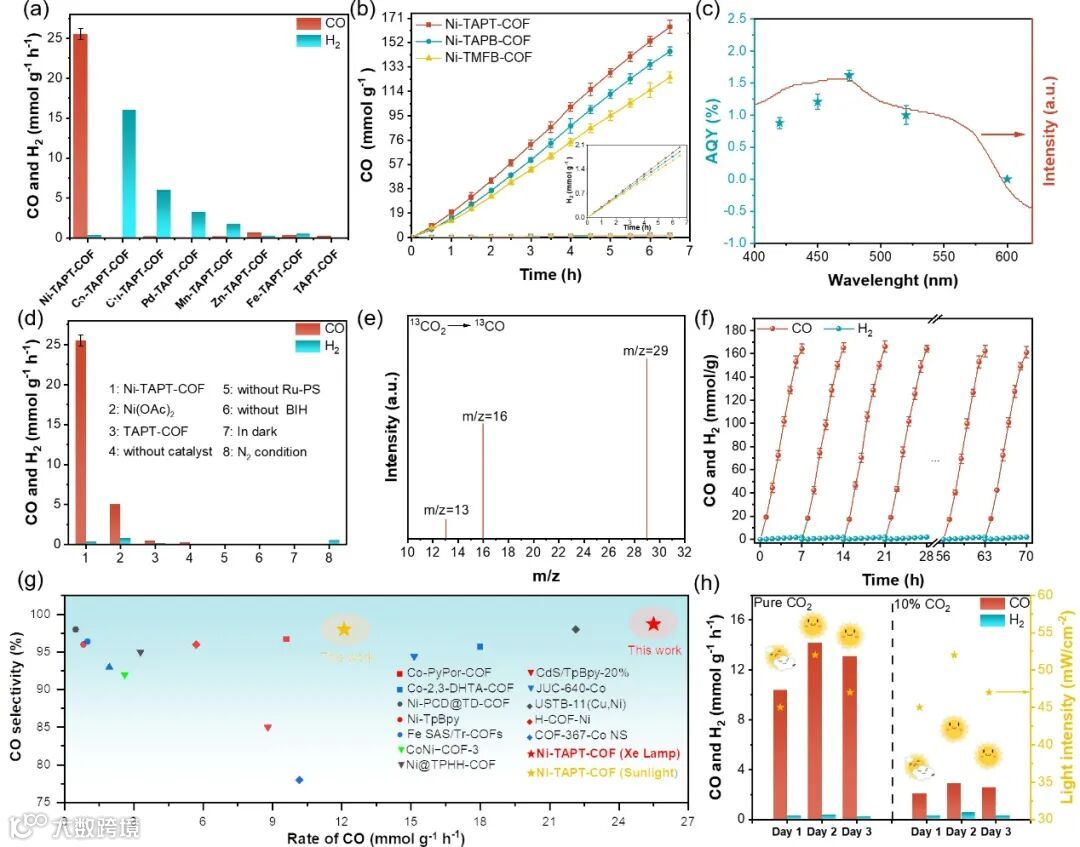 Figure 3. (a) Different metal ions were loaded in TAPT-COF (0.8 μmol based on metal) for CO2photoreduction over 2 h reaction. (b) Time-yield plots of CO product over Ni-TAPT-COF, Ni-TAPB-COF, and Ni-TMFB-COF. (c) The AQY tests under different wavelengths of monochromatic light and UV-vis absorption spectra of the Ru-PS. (d) CO evolution under various reaction conditions. (e) Mass spectrum of 13CO produced from the photocatalytic reduction of 13CO2 over Ni-TAPT-COF. (f) Cycling experiments with Ni-TAPT-COF. (g) Comparison of previously reported COF-based photocatalysts for photocatalytic CO2RR to CO with similar conditions. (h) Practical performance tests based on the Ni-TAPT-COF under natural sunlight.