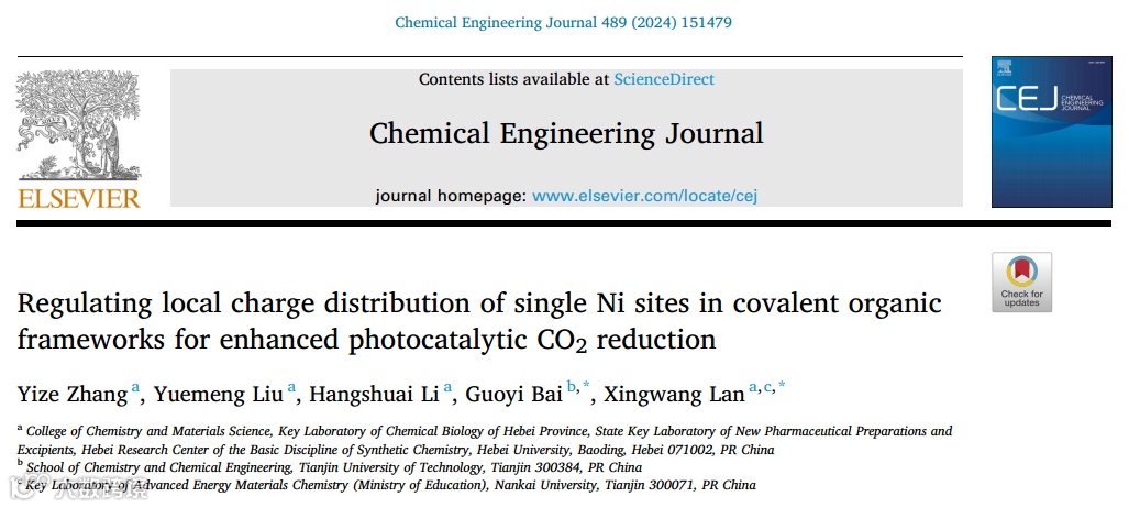 基于此,天津理工大学白国义教授与河北大学兰兴旺副教授在工程技术在化学化工领域顶级期刊《Chemical Engineering Journal》上发表题为“Regulating Local Charge Distribution of Single Ni Sites in Covalent Organic Frameworks for Enhanced Photocatalytic CO2Reduction”的研究论文。