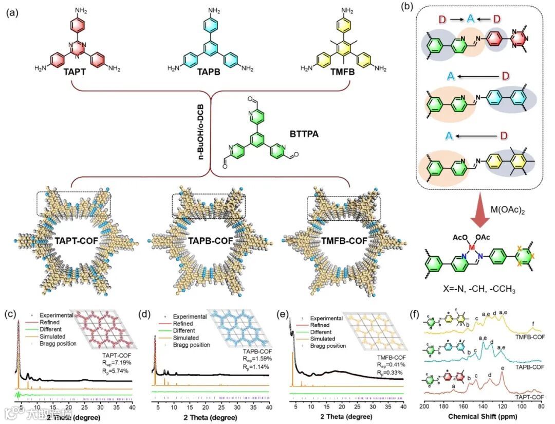 文章设计和合成具有亚胺吡啶部分的多功能COFs (TAPT-COF, TAPB-COF, and TMFB-COF)锚定单金属位点用于高性能光催化CO2RR到CO,其中强配位构象引导原子分散的金属位点在COFs的有序通道壁上预先设计的亚胺吡啶位置自发螯合。