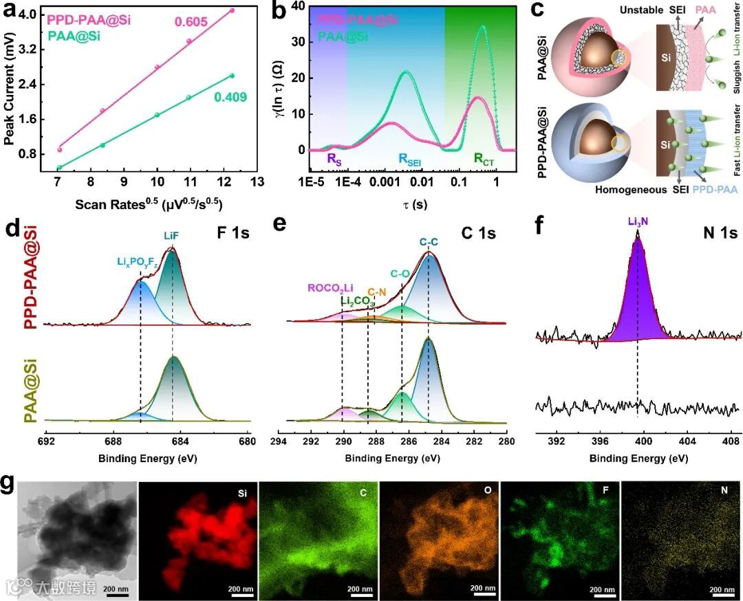 图 5 表层SEI分析。(a-c) 离子传输能力分析与示意图。(d-e) 对使用 PPD-PAA 或 PAA 粘合剂硅电极的SEI层成分分析。(g) 使用 PPD-PAA 粘合剂的硅电极在 100 次循环后的 TEM 图像以及相应的微区元素分布结果。
