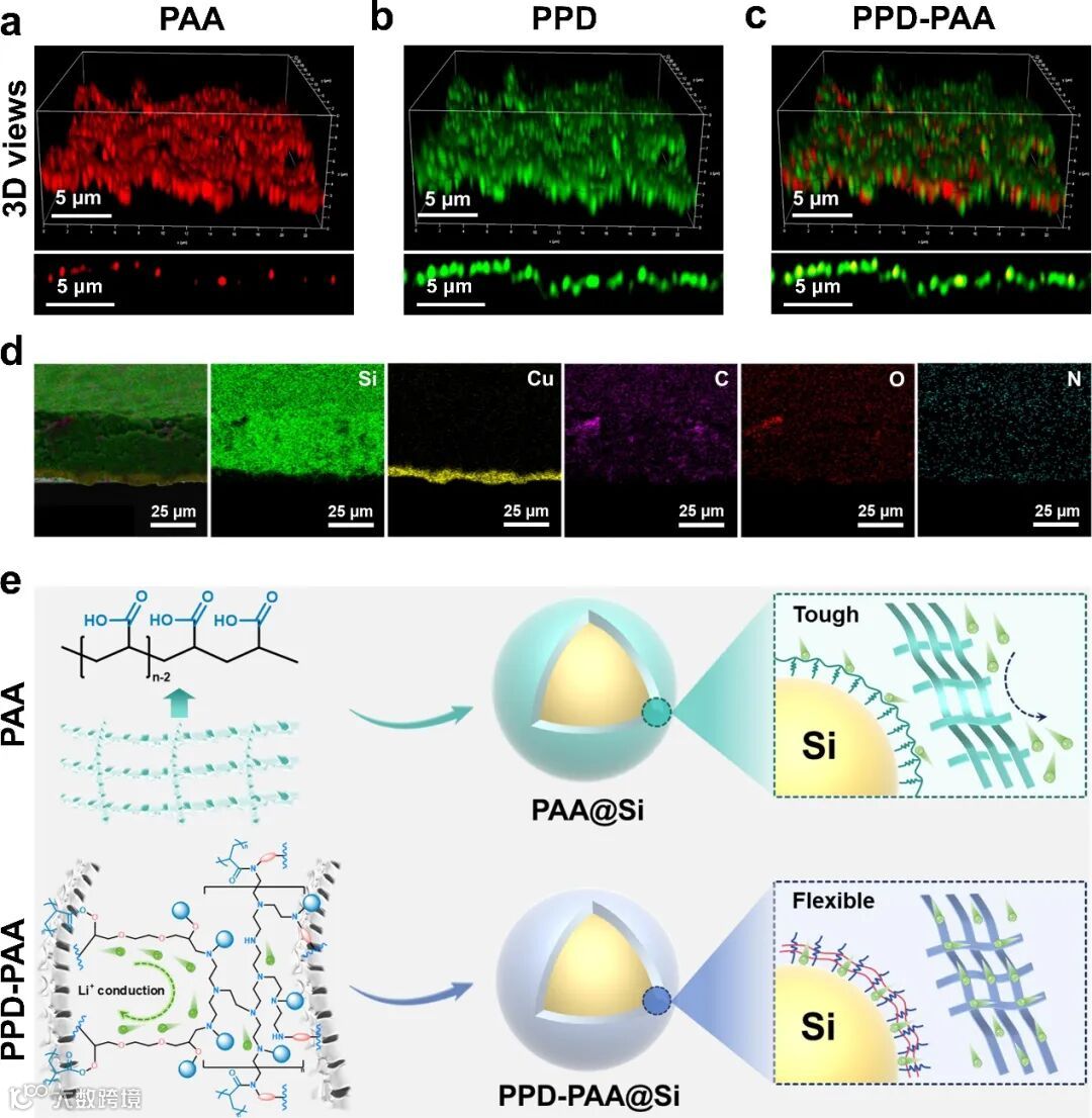 图 2. PPD-PAA粘结剂的结构表征、强韧性及导锂机制。PPD-PAA@Si 电极的三维共聚焦显微镜和横截面图像,其中 (a) PAA(红色)、(b) PPD、(c) PPD-PAA。(d) PPD-PAA@Si 电极的微观结构及元素分布。(e) PAA@Si 和 PPD-PAA@Si 电极内部的离子传输机制和结构变化过程。