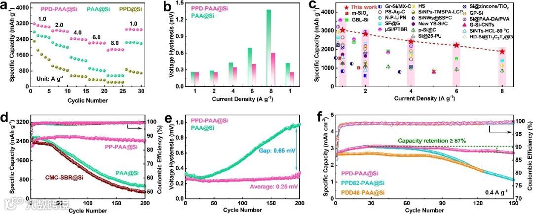 图 4. 电化学性能分析。(a)使用不同PAA、PPD 或 PPD-PAA 粘合剂的硅电极的倍率性能;(b) 锂化和脱锂过程中电压滞后。(c) PPD-PAA@Si 负极与其他已报道的硅负极极的倍率性能比较。(d) 使用PAA、CMC-SBR 或 PPD-PAA 粘合剂硅电极的长期循环性能;(e) 不同循环圈数下的电压滞后。(f) 高负载 PPD-PAA@Si 电极的长循环性能。