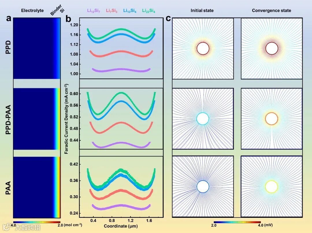 图 3. 不同PAA、PPD 和 PPD-PAA 粘合剂对硅电极内锂离子分布及传输的模拟结果。(a) 不同粘合剂下的锂离子浓度分布。(b-c) 不同锂化过程中锂离子浓度分布与相对应的法拉第电流密度。