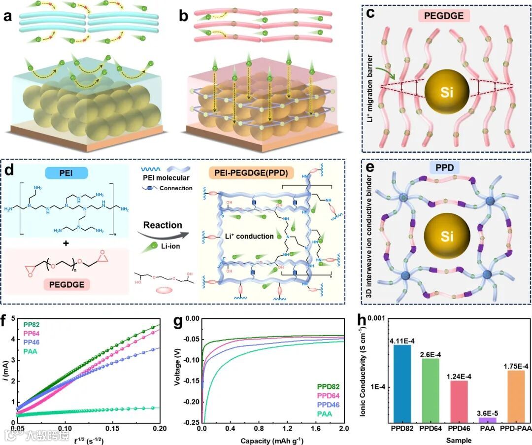 图 1. 不同粘结剂调变硅负极离子传输与结构稳定机制。(a) 传统弱导锂粘结剂中离子传输过程示意图;(b)聚合物链中的环氧乙烷和胺基促进的锂离子传输示意图。(c)循环过程中导电聚合物的结构破损机制。(d) PPD-PAA 聚合物的高离子导电性和 (e) 强结构稳定性。(f) 基于 PAA/Cu、PPD82/Cu、PPD64/Cu 和 PPD46/Cu 的 Chronoamperogram 的电流 (i-h) 评估PAA、PPD82、PPD64 和 PPD46 四种粘合剂的离子电导率。